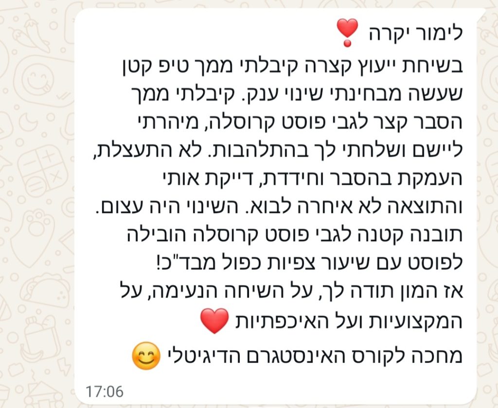"תודה רבה לימור!! קיבלתי ממך המון ידע עשיר ומגוון לאיך לקדם את עצמי באופן אורגני, איך להסתכל על מטרות בדרך אחרת ולא לתת לפחד להשתלט וכמובן - איך לבנות מוצר, קהל, מה המניע, בידול, דף עסקי, ניראות.. ומעבר לזה את מקסימה, חייכנית וכזו שלא מתרגשת לפגוש את הפחד של מי שמולה. אז תודה על הכל, ממליצה בחום!!"