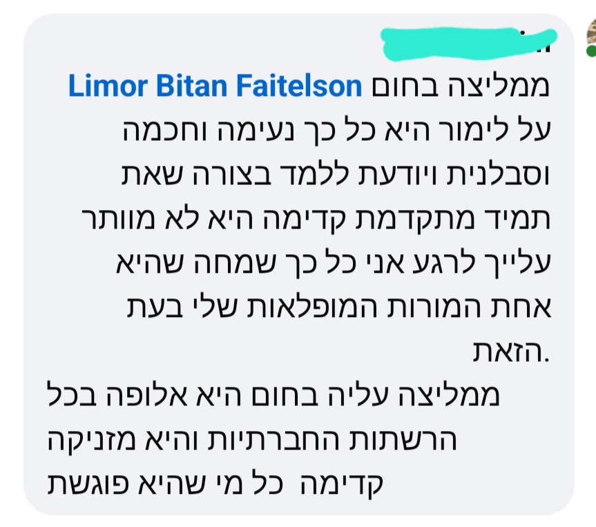"לימור נתנה לי בטחון לשווק בכל הכוח, במיוחד לאחר החגים כשהייתי צריכה להניע מחדש את עצמי ואת העסק. גם כששאלה שאלות קשות שלא תמיד ידעתי לענות עליהן, היא כיוונה אותי ברגישות ונחישות לדייק את המסרים ונתנה תמיכה סופר מקצועית!!! והכי חשוב בעיני, השקט שבליווי שלה, בשילוב הקלילות והתכנון המדוייק עשו לי סדר בראש ושמחה בלב... לימיק את השראה 💕"